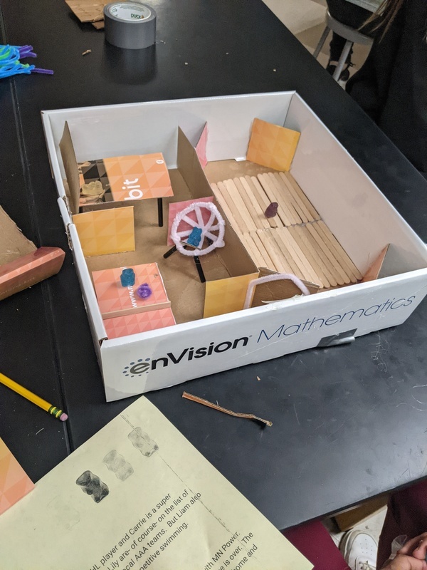 One way these experiences are introduced is in an activity Mrs. Klyn does with her students during their first week of the STEAM class. Design thinking encourages students to focus on the human needs when creating. Students are asked to build a house for a gummy bear family, they read through the different families' needs and pick one to design a home for. Fine motor skills like using hot glue guns, drawing, and cutting are used on a wide variety of materials like pipe cleaners, cereal boxes, string, popsicle sticks, etc. Mrs. Klyn gives the students a short amount of time to brainstorm and build -- it’s set up this way so students are not able to create a fully finished project. She does this for several reasons: students can use building as a way of brainstorming, if you know it’s not going to be perfect there’s some freedom with engaging big ideas, thinking about how they might continue their work, and what they might have done differently. This can be an uncomfortable process for many students who view school as a place that only honors perfection. Rapid prototyping like this forces students to let go of perfection, there’s no way they’re going to create a finished project, so it allows them to enjoy the creative process.